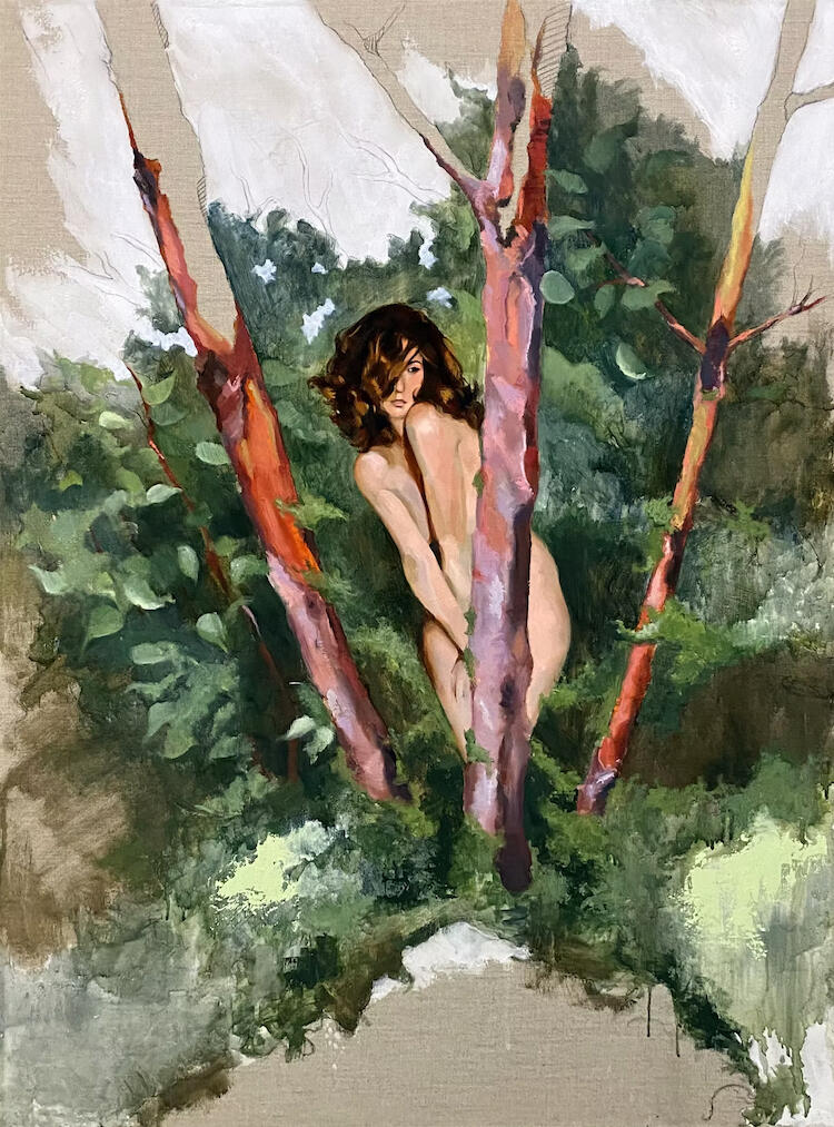 “My current body of work document an exploration into the traditional genre of the human figure reconnecting with nature outdoors. These paintings have evolved with me as I continue to search for artistic solutions that reveals the evidence of my technical picture-making process. In this attempt to demystify yet elicit a sense of appreciation for the procedure of painting, it has been imperative to strike a balance between its exposure and more refined focal points. My goal is to have each composition emanate from a near realistic focal point, that fades into a vignette of increasingly desaturated-paint and exposed-charcoal marks. The highly rendered figures prove my competency as a painter and can be bordered by more supportive and expressive abstract imagery of flora."